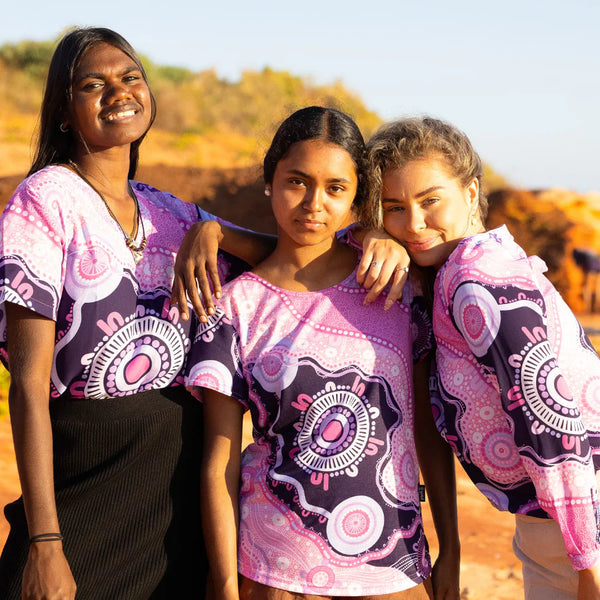 Tara Butterworth is a proud Wagiman woman who uses her artwork to tell stories of her life and her connection to culture and family. The title of Tara’s vibrant piece for our NAIDOC collection is called "Ngal-gawu" Grandmother (mothers mum). Her art is a reflection of the most important Elder in her life, her grandmother and everything that she means to her family.