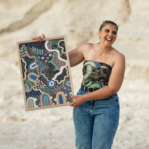 Our elders play such a huge role in our community. I wanted this piece to reflect the most important elder in my life and her guidance from the dream time for me and my siblings, while also acknowledging the elders still with us, who fight alongside our communities everyday, paving the way for the next generations.” - Tara Butterworth