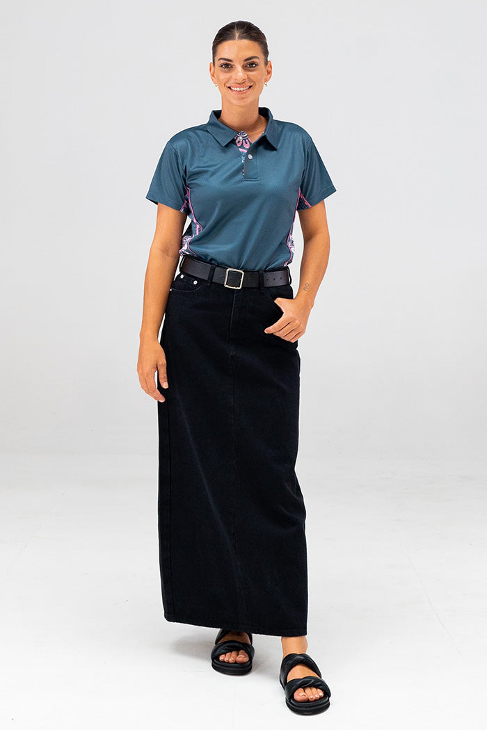 Caitlin Trindall is a Gomeroi artist who creates digital art inspired by her life experiences, bringing First Nations culture and art into new spaces. Her first polo collection explores themes of flora, the joy of being on Country, and the gratitude and peace of immersing yourself in the present moment.