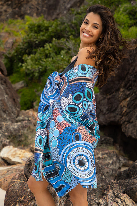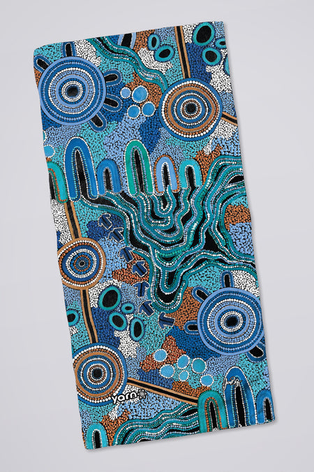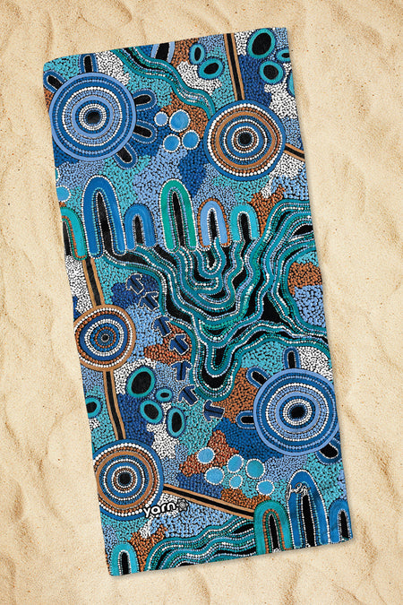 Get ready to kick back and relax at the beach or pool with this beautiful towel. Made from soft and absorbent fabric with a cotton backing, this towel is perfect for drying off after a swim or lounging in the sun. Each towel features a beautiful, sublimated design that tells a unique story of the artist's deep connection to Country.
