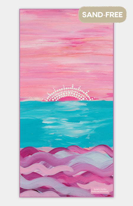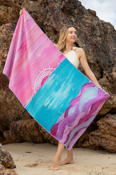 Elevate your next beach trip with our luxurious sand-free beach towels, showcasing stunning artwork by First Nations collaborating artists. Each towel features a beautiful, sublimated design that tells a unique story of the artist's deep connection to Country.