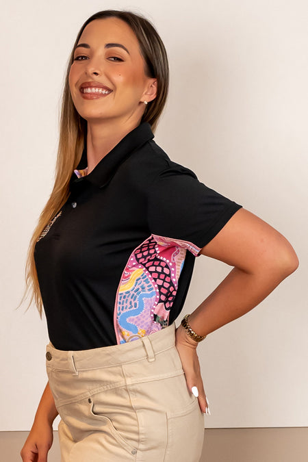 These soft, breathable polo shirts are made from sustainably grown bamboo and have a high sun protection factor of UPF50+. A more subtle take on our classic polo, they feature contrast panels running down the sides and inner collar. Available in fitted and unisex styles that showcase the vibrant First Nations artwork created especially for the 2024 theme.