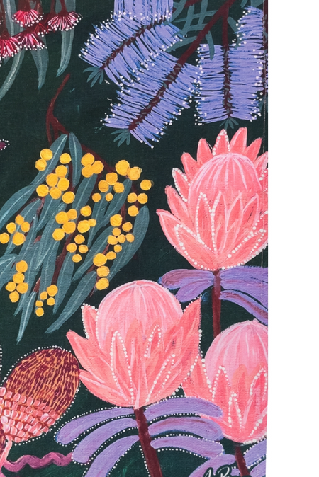 Proud Yued Noongar artist, Jessica Begg draws inspiration from her family, the native flora of the Yued region, the heat in the summer, the Moore River and the meeting places in between. Her distinctive contemporary style is her interpretation of her culture through an unrestricted palette and traditional shapes.