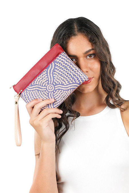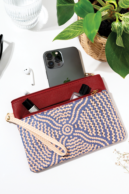 Our Panel Zip Purses boast a simplistic shape that's perfect for any occasion. They feature an array of beautiful prints designed by Indigenous artists from the remote desert communities of Yuendumu and Nyirripi in Central Australia. This slimline zip purse can be used both day and night; whether rushing out the door to go grocery shopping or go out dancing with your girlfriends it’s a timeless piece that will compliment any outfit. Experience ultimate organisation with two spacious zipper compartments to fit your phone, car keys, cards, cash and your emergency lippy and powder.