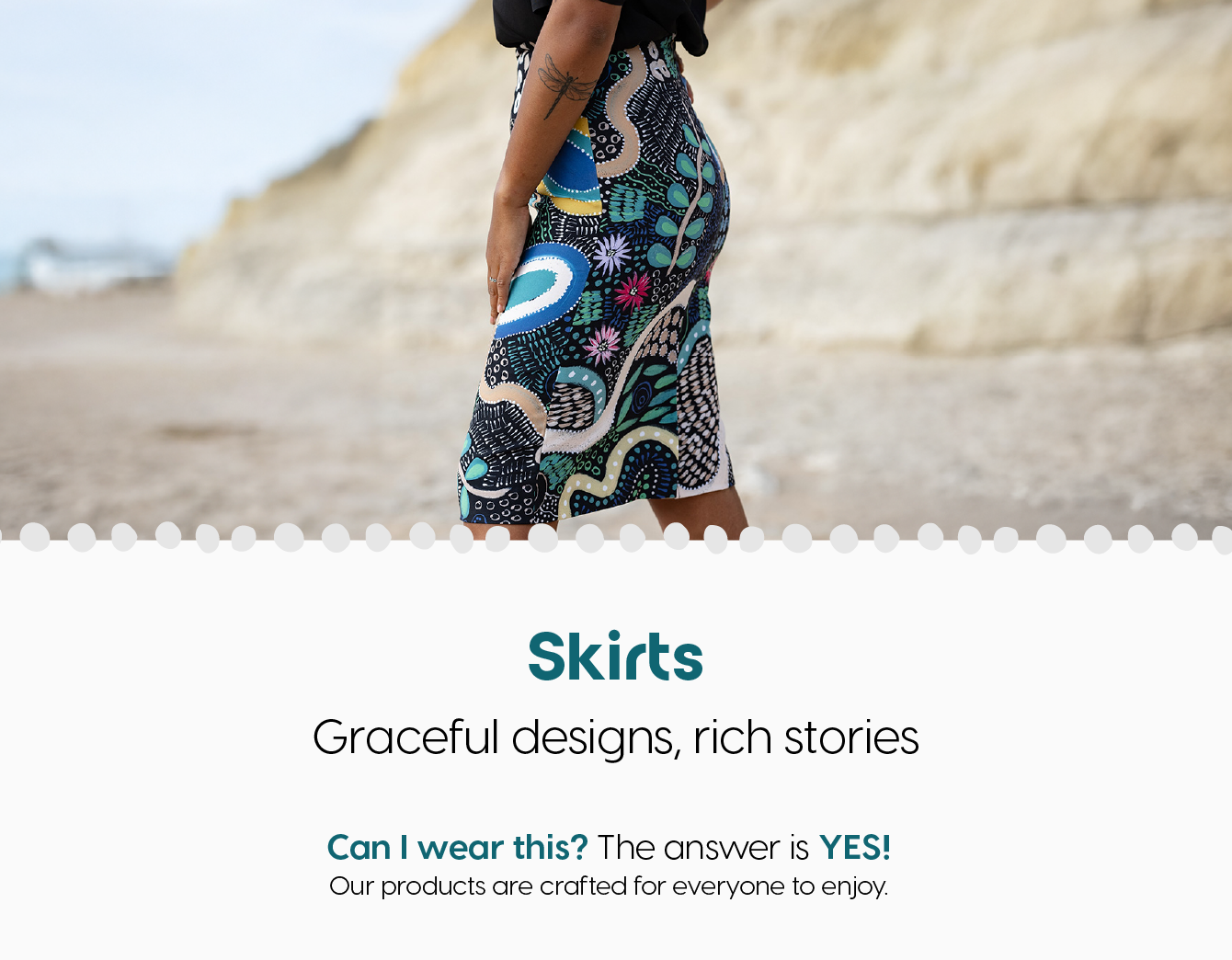 All our women's skirts are made completely out of polyester, a fabric that makes for a durable, low-maintenance, stain-resistant and easy wash fabric, that is truly low-maintenance. The polyester composition also means that the colours and patterns on our designs will stay vibrant for longer. Each skirt also features an invisible zip at the middle of the back, for a premium sleek finish. With a universally flattering pencil-cut design, our skirts are truly a must-have in any woman’s wardrobe. Ethically sourced and featuring authentic Indigenous artworks, these gorgeous skirts directly help support First Nations artists and their livelihoods.