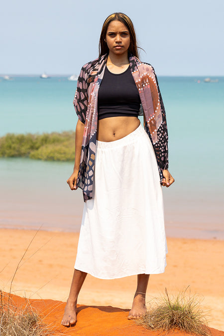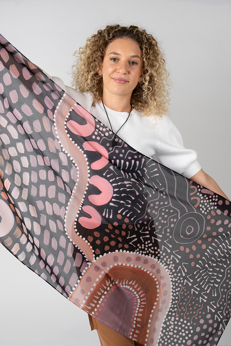 Featuring vibrant artwork from Caitlyn Davies-Plummer (Dustin-Koa Art), these scarves drape beautifully and add colour to your outfit without heaviness or bulk.