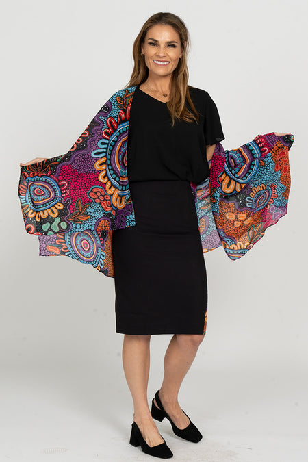 Available in a generous single size, our shawls are tailored with arm holes for the perfect fit. They are made from soft, flowing chiffon that holds colour beautifully. A lightweight and breathable piece that works in all seasons.