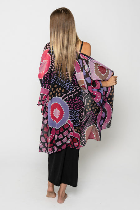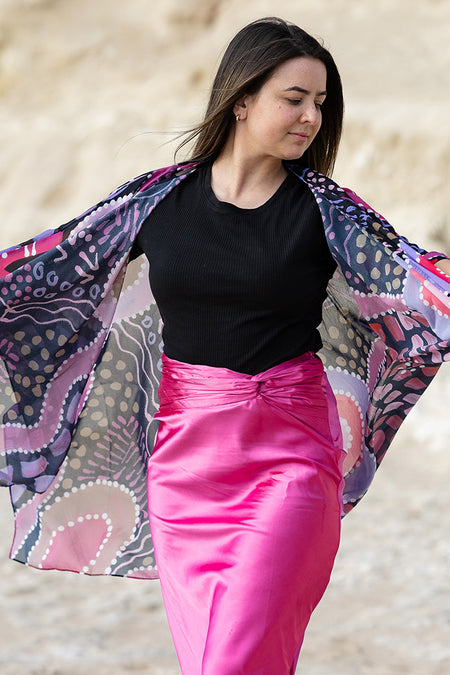 Available in a generous single size, our shawls are tailored with arm holes for the perfect fit. They are made from soft, flowing chiffon that holds colour beautifully. A lightweight and breathable pop of personality that works from day to night.