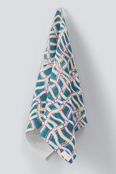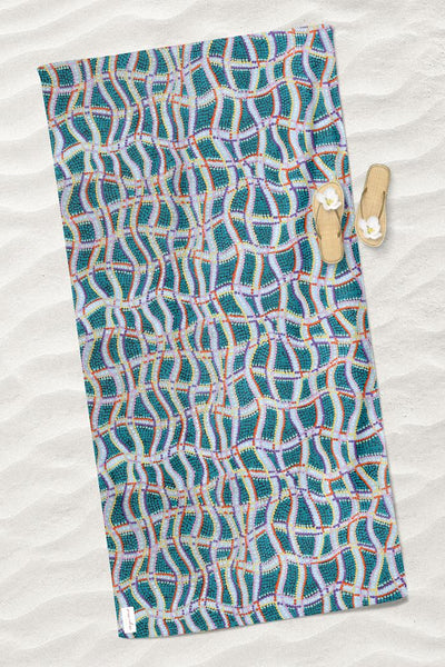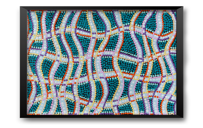 This painting features Lukarrara (desert fringe-rush seed). It grows on a grass and the seed is edible. It is an important food source that can be used in a number of ways including making flour used for damper bread.