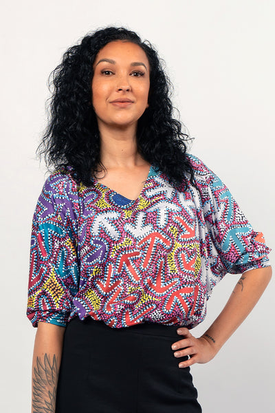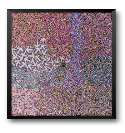 This Jukurrpa tells the story of a 'yankirri' (emu) and 'wardilyka' (bush turkey). The yankirri lived at a soakage to the west called Warnirripanu, while the wardilyka lived at a soakage to the east called Parirri. The emu and the turkey used to go around country picking 'yakajirri' (bush rasins) and mashing them into 'kapurdu' (fruit balls) to save in their nests for later.