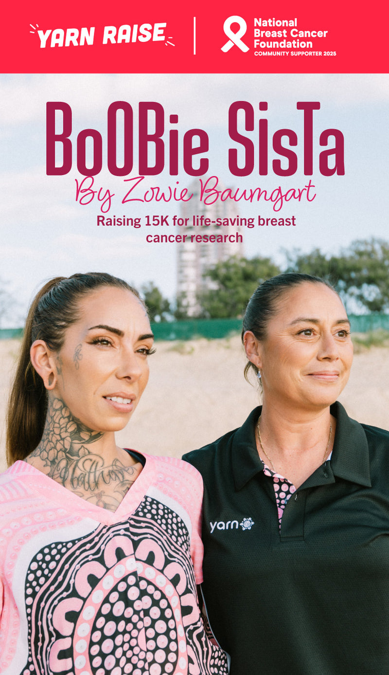 The pieces in this collection feature Zowie’s artwork ‘Boobie Sista’, a captivating blend of contemporary pink colours with Indigenous painting techniques. The painting tells the story of how a community rallies to support each other and was inspired by her best friend Kelly’s experience with Breast Cancer. Kelly was only 38 when she discovered a lump on her breast that led to a diagnosis. Her first concern was for her young daughter, and how this might be difficult for her. Through the support of her friends and family Kelly was lucky enough to make a full recovery and was determined to share her story in the hopes it would encourage others to take care of their health.