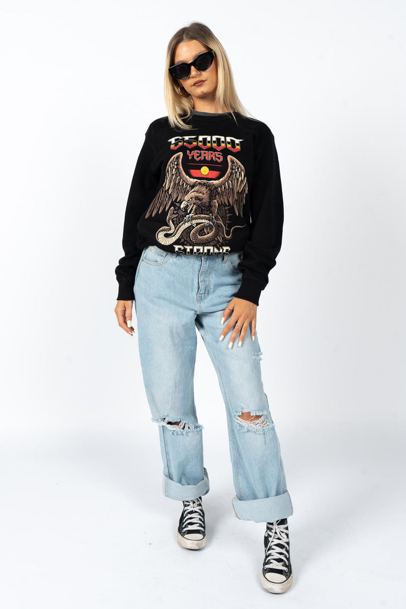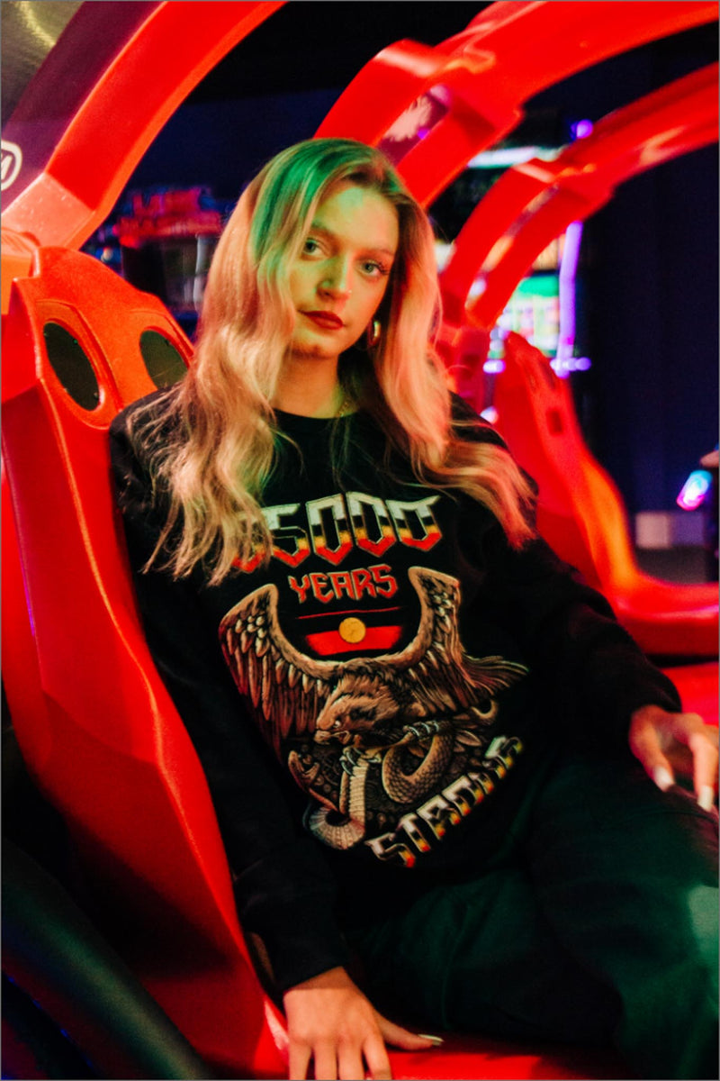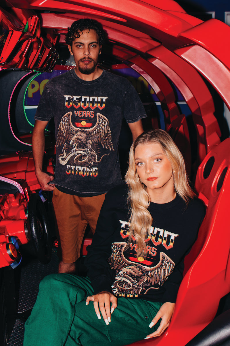 Stay warm and stylish with this vintage style sweater from the Ancient Things Yarn Street collection. The designs combine an homage to 80’s pop culture with unique Indigenous Australian designs and themes. This sweater is made from 100% cotton and features cool designs suggestive of a band shirt from the 80’s. The Indigenous Australian themes bring a fresh new twist to a fashion style that is all the rage right now.