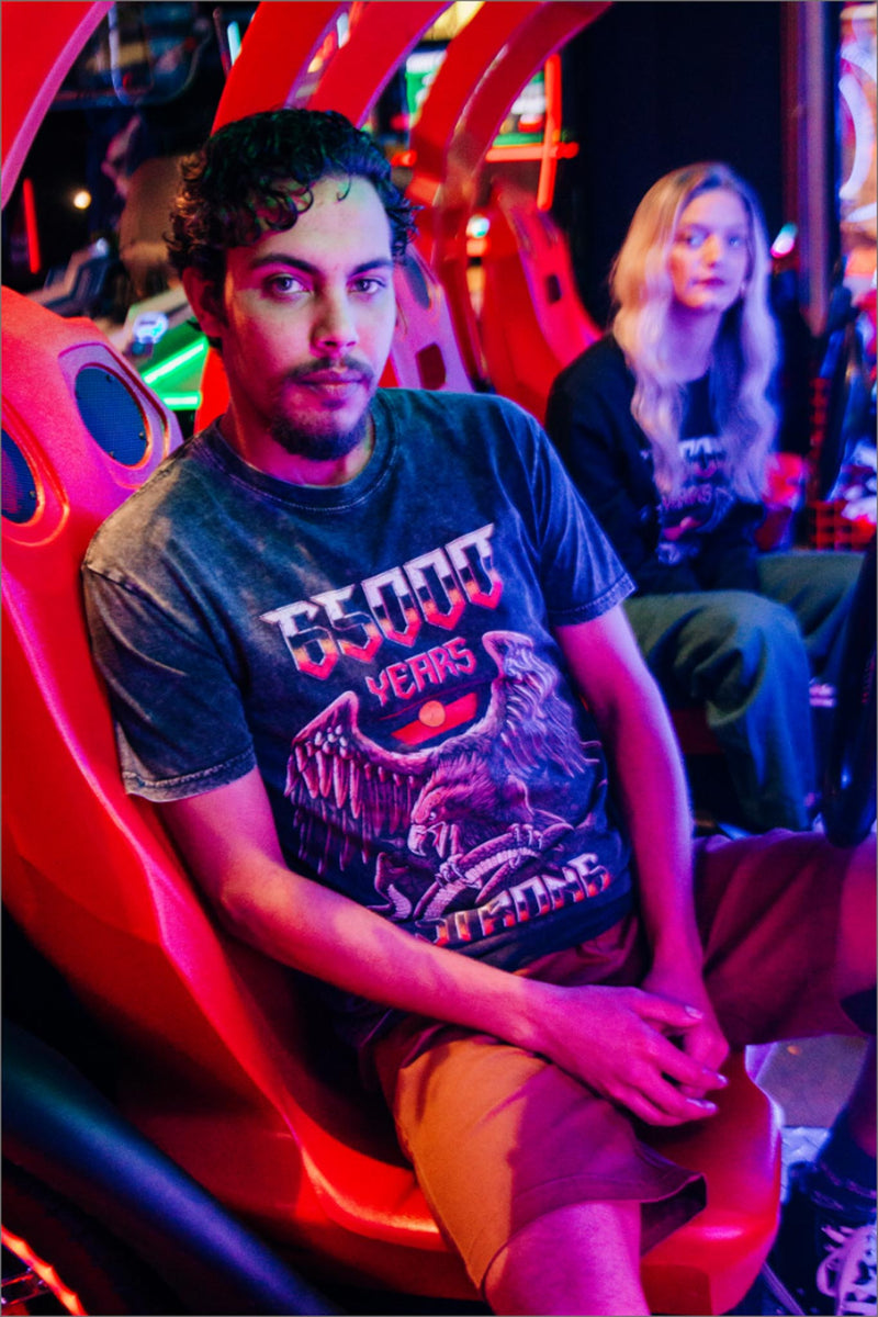 A wardrobe staple, this vintage style tee combines elements from 80’s pop culture with unique Indigenous themes. This shirt from the Ancient Things Yarn Street collection is made from 100% cotton and features trendy designs suggestive of a band tee from the 80’s. The First Nations themes bring a fresh new twist to a streetwear style.