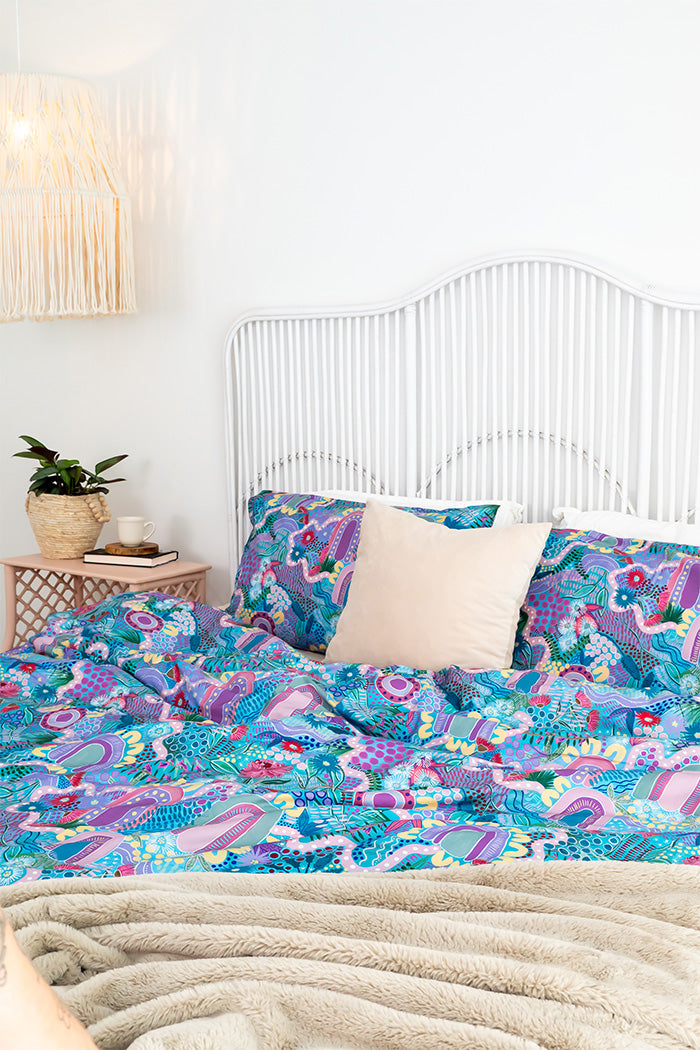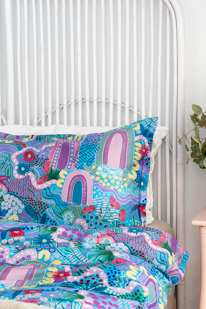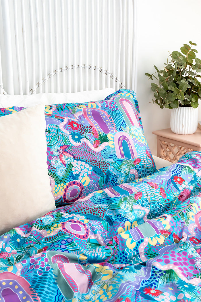 Drift into a world of elegance and artistry with our premium quilt cover sets, where breath taking landscapes meet exceptional craftsmanship. Designed by First Nations artists from across Australia, each piece captures the beauty of nature in soft, shimmering hues, transforming your bedroom into a serene retreat.