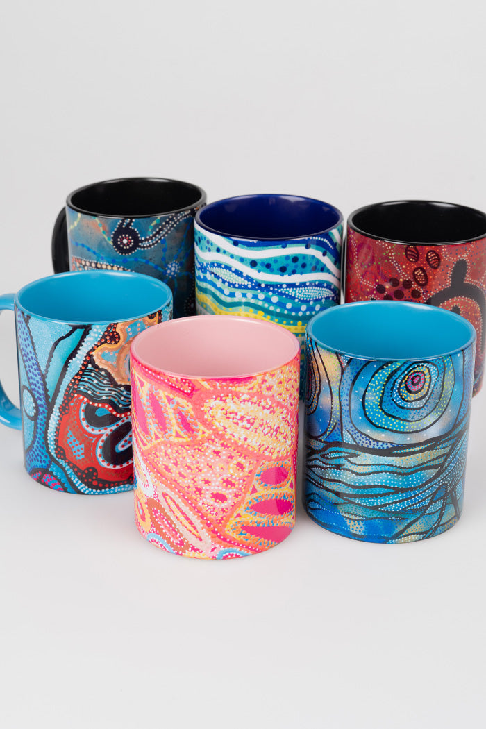 Add a splash of amazing Indigenous art to your kitchen with this deadly set of 6 ceramic mugs. Classic in shape and stunning in design, our mugs are perfectly portioned for sipping hot cocoa, tea or your morning cup of coffee.
