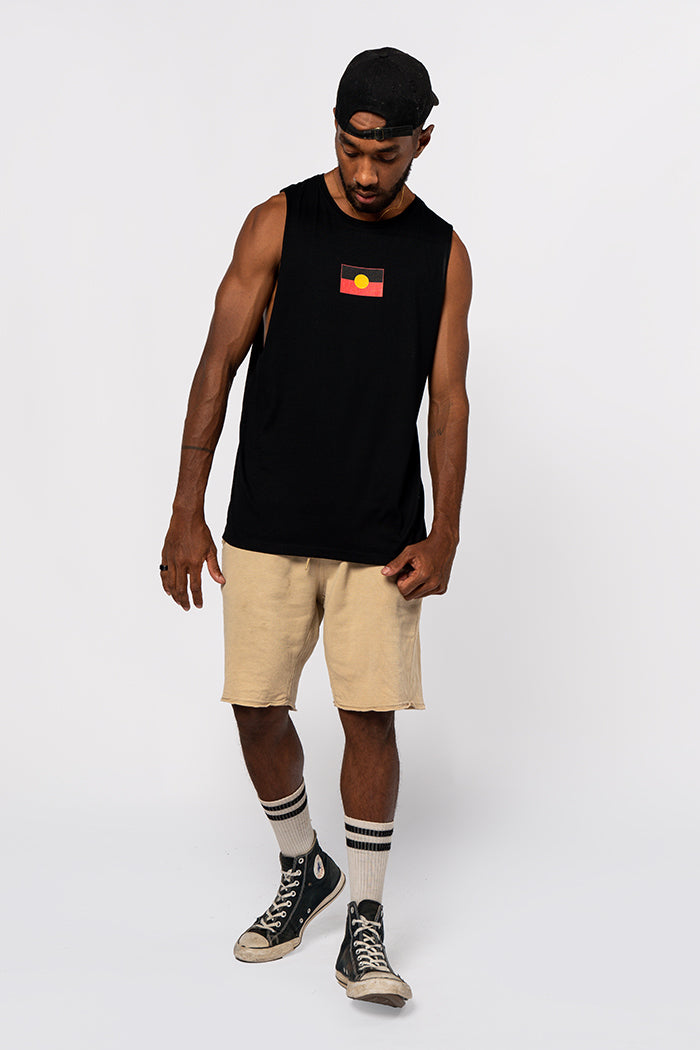 This men’s muscle top is a part of our ‘Raise the Flag’ collection, a range of products that celebrate the Aboriginal flag finally being freed and placed into public hands.