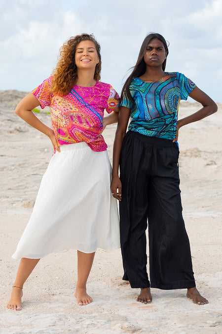 We collaborate with a large community of First Nations artists from across Australia, each bringing their own unique and authentic artistic style. The foundation of partnerships is respect, empowerment, and celebration, with royalties paid to artists on every purchase – supporting long-term career growth and creativity. Discover and learn about artists here.