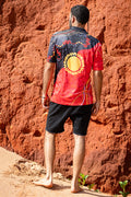"A flag-inspired design with community and connection at its centre. Hand in hand around the sun our community gathers on Country for rejuvenation and healing. The suns fingerprint echoes through our skin, while our stories decorate the red earth." - Teagan