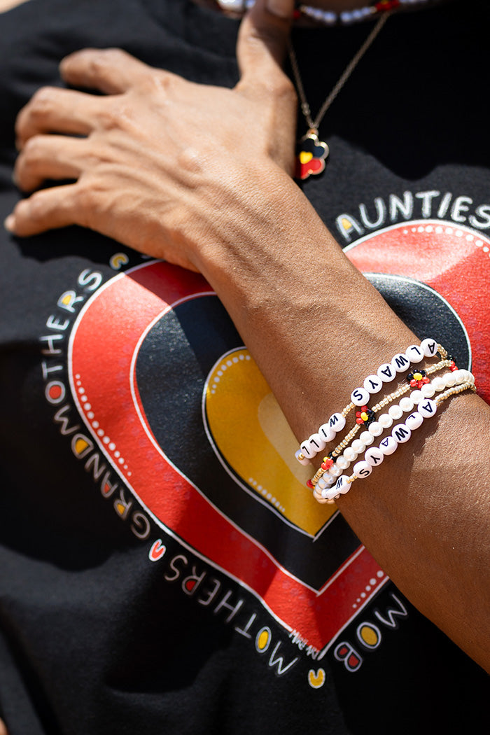 Add some beautiful colour and vibrancy and make a supportive and proud statement with this stunning bracelet. Vibrant beading that spells out 'Always Was, Always Will Be' that reminds everyone that they are standing on unceded Aboriginal land.