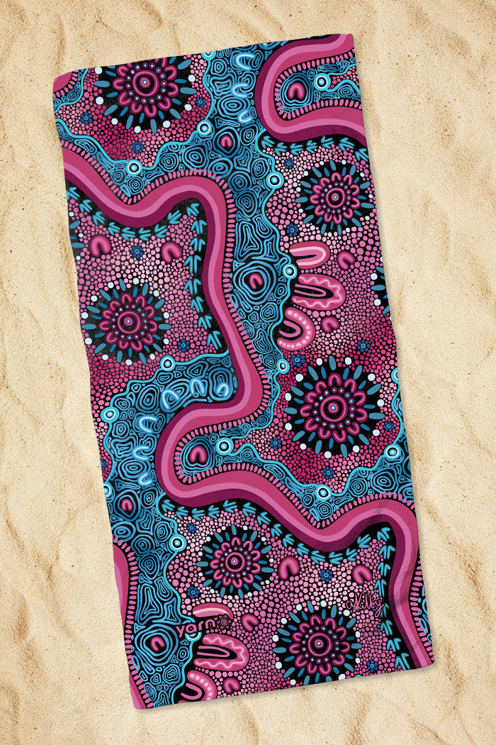 Get ready to kick back and relax at the beach or pool with this beautiful towel. Made from soft and absorbent fabric with a cotton backing, this towel is perfect for drying off after a swim or lounging in the sun. Each towel features a beautiful, sublimated design that tells a unique story of the artist's deep connection to Country.