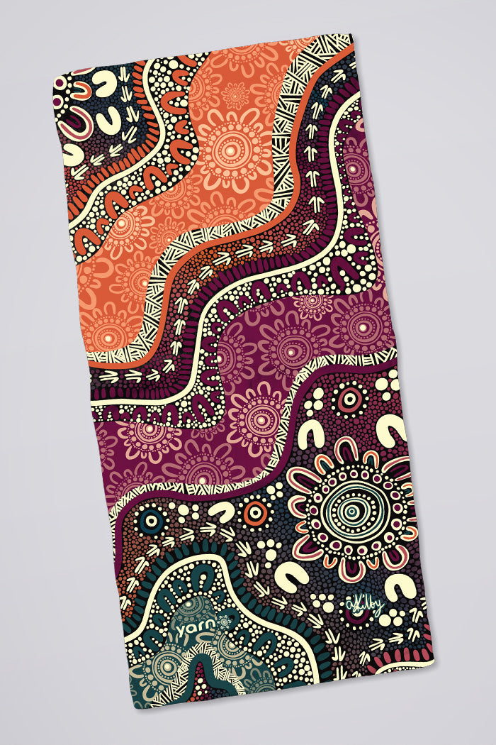 Get ready to kick back and relax at the beach or pool with this beautiful towel. Made from soft and absorbent fabric with a cotton backing, this towel is perfect for drying off after a swim or lounging in the sun. Each towel features a beautiful, sublimated design that tells a unique story of the artist's deep connection to Country.