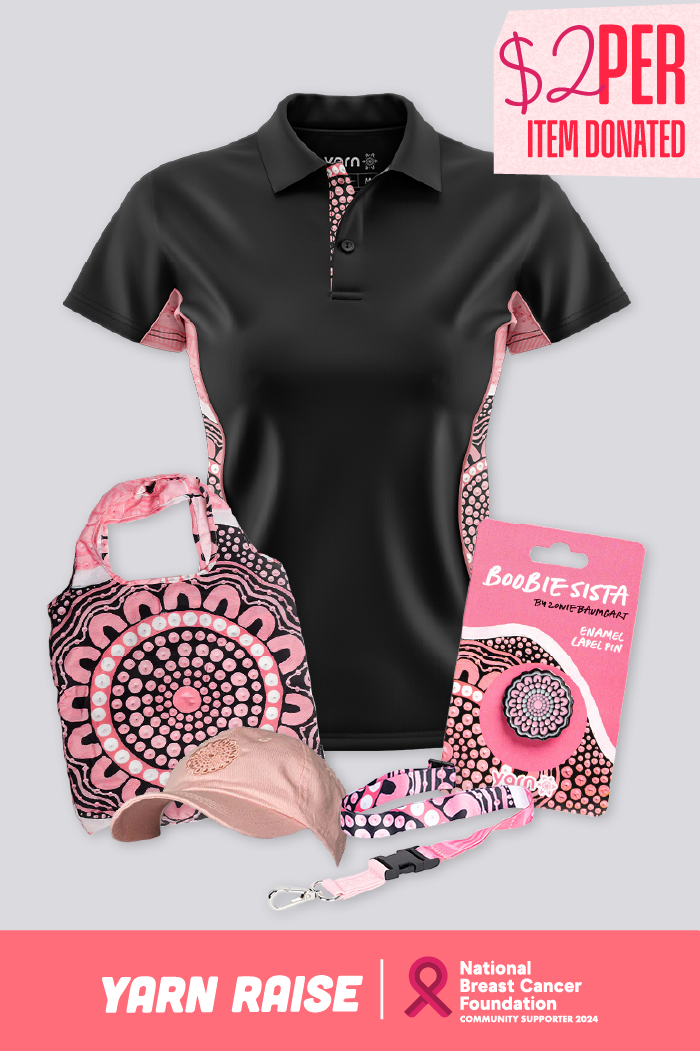 Yarn is proud to partner with the National Breast Cancer Foundation (NBCF) and Kombumerri and Butchulla artist Zowie Baumgart to introduce our limited-edition collection ‘Boobie Sista’. For each product sale from this collection, Yarn is donating $2 to NBCF to support world-class breast cancer research.