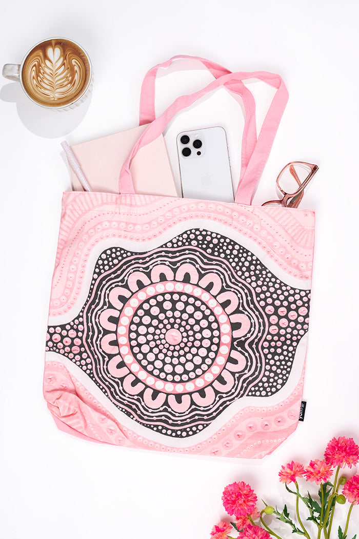 Our full print tote bag is perfect for carrying everything you need for as long as you need it. Perfect for beach days, shopping trips, or everyday errands, it boasts a sturdy cotton construction and long handles for comfortable carrying. With its eye-catching First Nations artwork, this tote is as durable as it is fashionable, making it an essential addition to your collection.