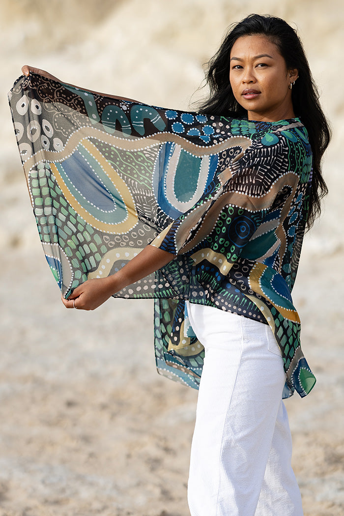 Available in a generous single size, our shawls are tailored with arm holes for the perfect fit. They are made from soft, flowing chiffon that holds colour beautifully. A lightweight and breathable pop of personality that works from day to night.