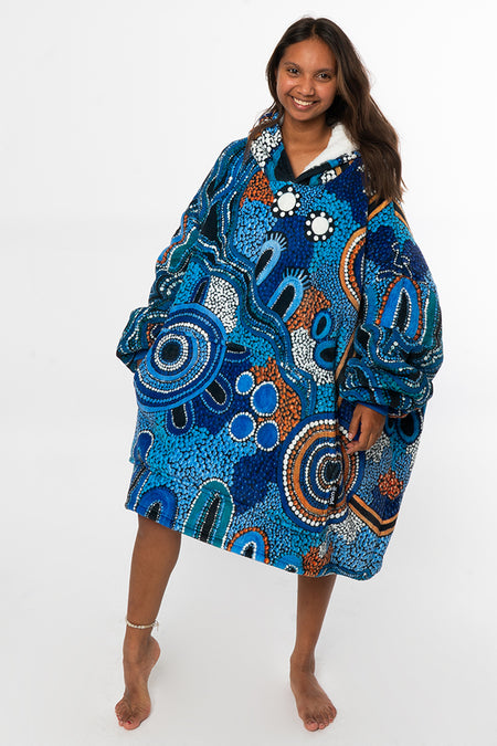 For rainy days and movie marathons you can't go past a snuggly, wearable blanket. Our Hooded Blankets are the ultimate in softness with a warm, sheepy lining and a soft fleece outer. Wrap up in beautiful First Nations artwork patterns