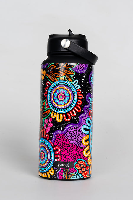 Our beautiful insulated stainless steel handled bottles are perfect for staying hydrated during your day-to-day activities. The double-walled vacuum design is printed with fabulous First Nations artwork that keeps your drinks cold for 24 hours and hot for 12 hours.