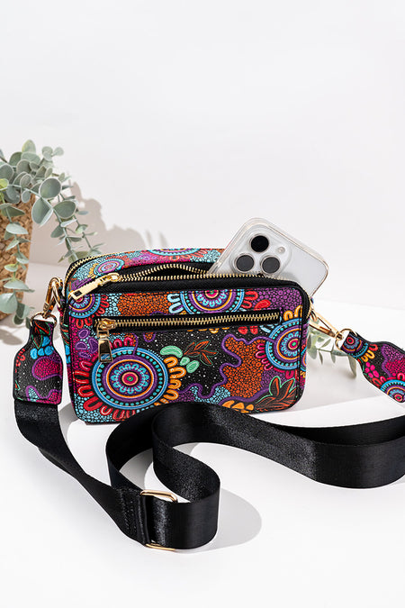 Fabric: Digitally printed PU exterior. PU interior and 70% Cotton 30% Polyester lining. Polyester strap. Gold metal zip closures.