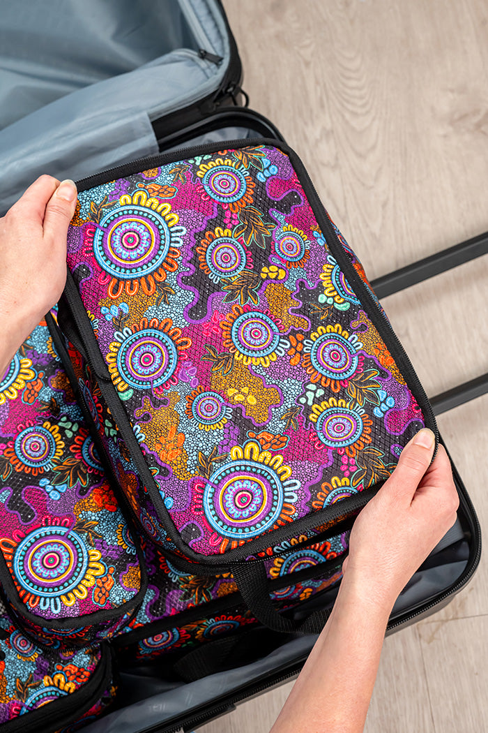 Travels ahead? Stay organised in style on your next adventure with our 5 pack of packing cubes featuring vibrant First Nations designs.
