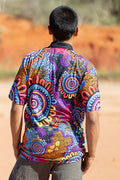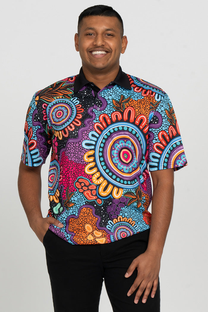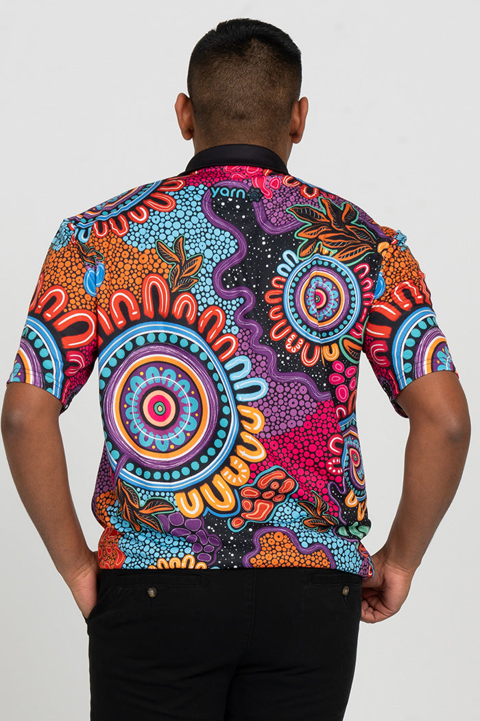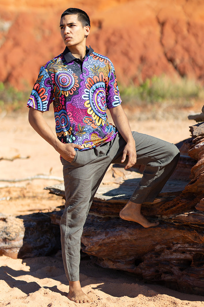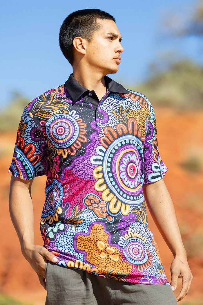 "This design represents people from all nations coming together to celebrate our beautiful cultures. With all our Elders surrounded watching the next generation grow with strong identities while they practice culture, dance, language, art and story telling." -Alkina