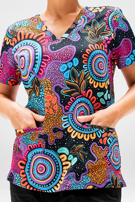 Brighten up long days on your feet caring for those who need it most! Our scrubs feature First Nations artwork printed onto excellent quality workwear that is both practical and beautiful.