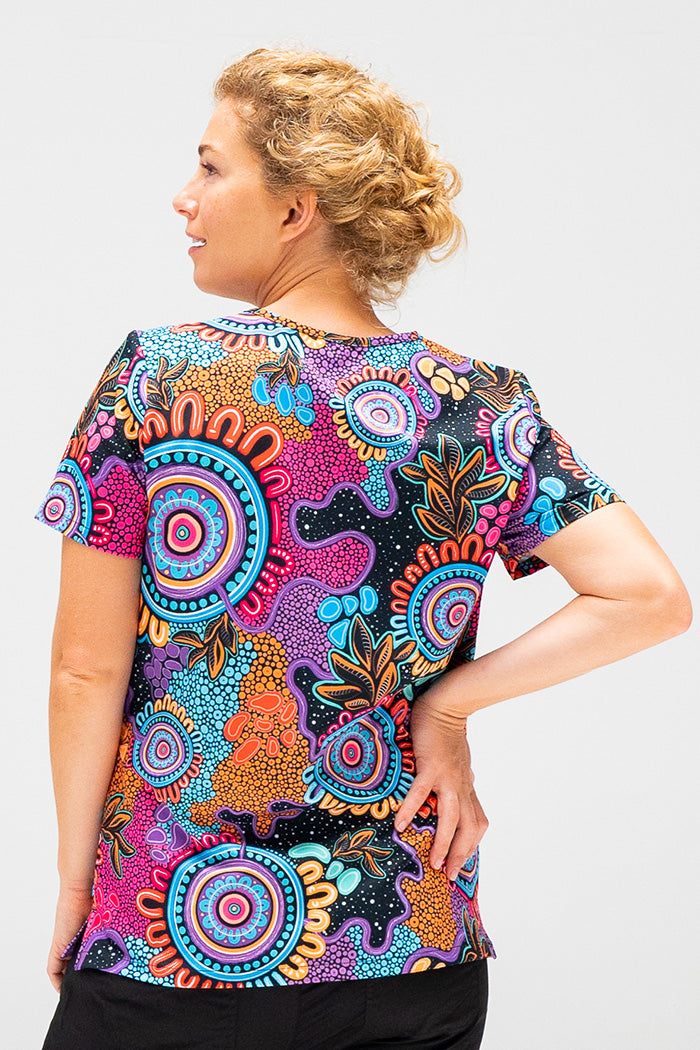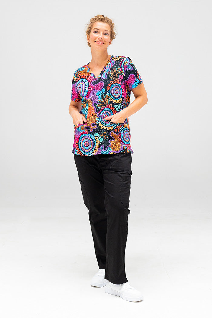 Brighten up long days on your feet caring for those who need it most! Our scrubs feature First Nations artwork printed onto excellent quality workwear that is both practical and beautiful.