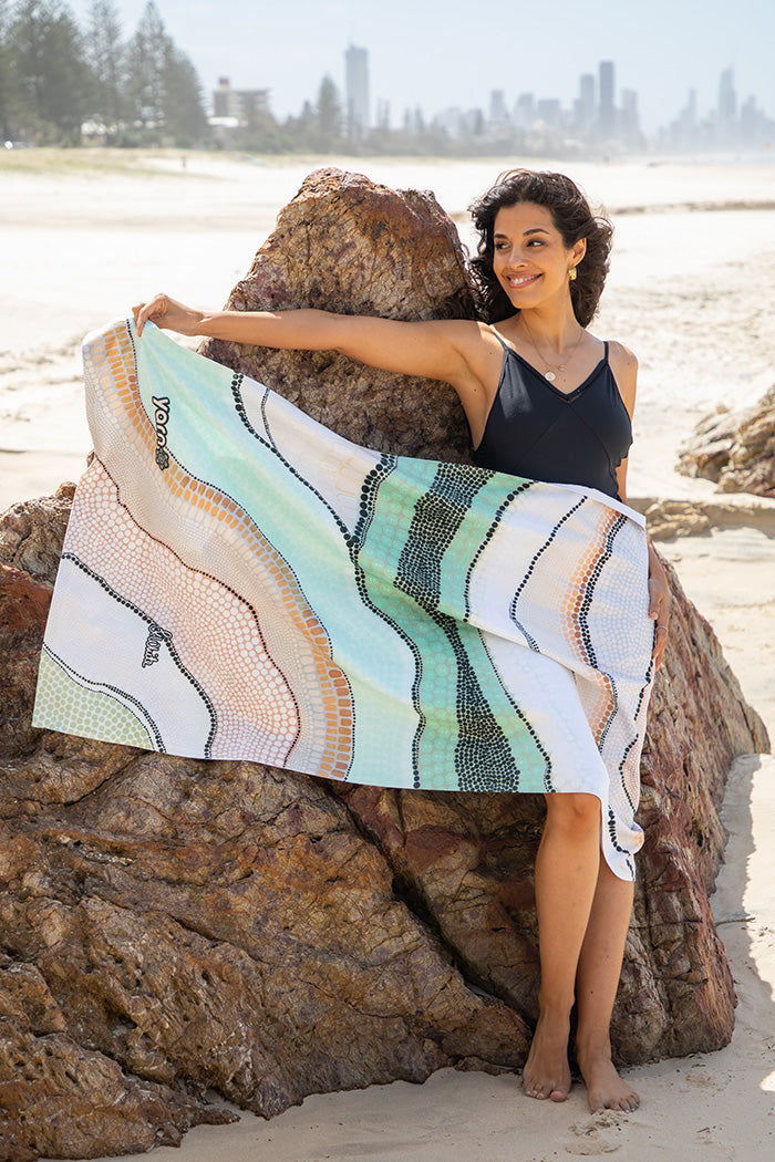 Get ready to kick back and relax at the beach or pool with this beautiful towel. Made from soft and absorbent fabric with a cotton backing, this towel is perfect for drying off after a swim or lounging in the sun. Each towel features a beautiful, sublimated design that tells a unique story of the artist's deep connection to Country.