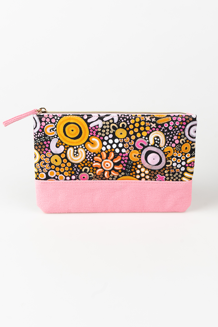 Our brand new line of beauty bags are available in four sizes featuring artworks from the incredible artist Merindah-Gunya. With durable canvas material, a water resistant lining and sturdy metal zippers, these bags are perfect for storage and travel for your beauty products, makeup, toiletries and more! Softly structured and cushioned to protect your valuables.