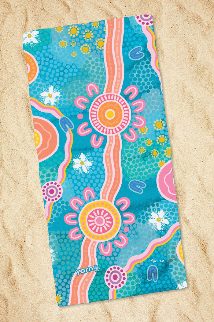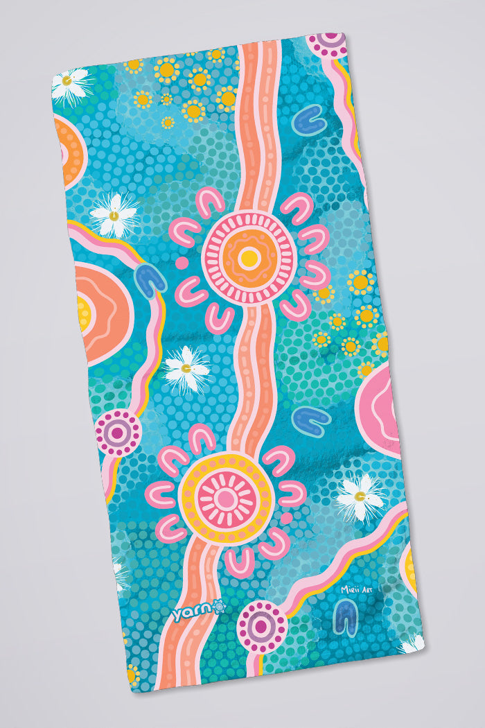 Get ready to kick back and relax at the beach or pool with this beautiful towel. Made from soft and absorbent fabric with a cotton backing, this towel is perfect for drying off after a swim or lounging in the sun. Each towel features a beautiful, sublimated design that tells a unique story of the artist's deep connection to Country.