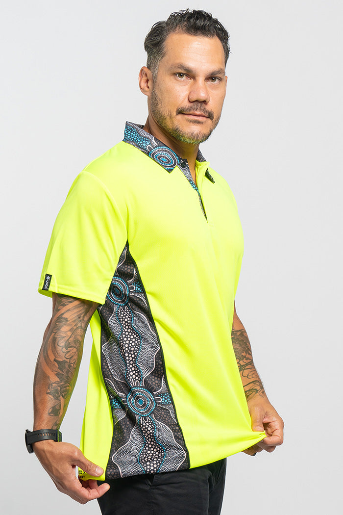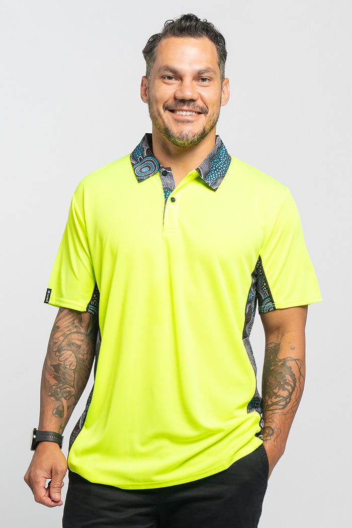 Designed for those working in tough, high-demand environments, our Hi-Vis Polos combine functional safety with meaningful design. Featuring authentic First Nations artwork on the collar and side panels, these polos bring a distinctive edge to standard workwear - offering a respectful and visually striking way to show support for First Nations artists on site.