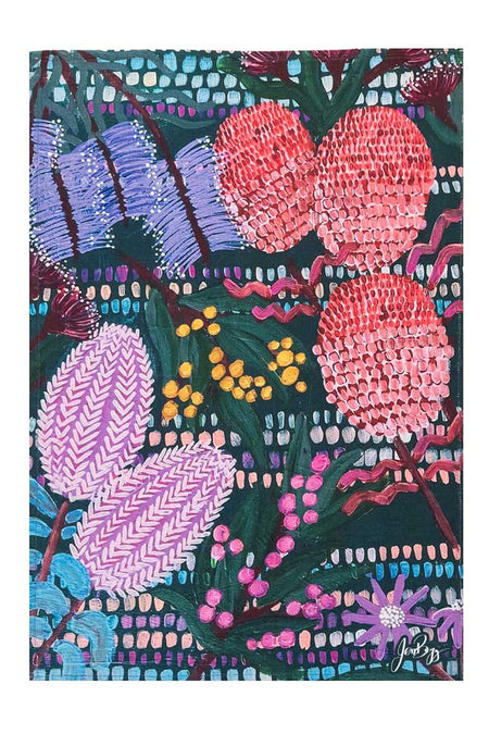 Proud Yued Noongar artist, Jessica Begg draws inspiration from her family, the native flora of the Yued region, the heat in the summer, the Moore River and the meeting places in between. Her distinctive contemporary style is her interpretation of her culture through an unrestricted palette and traditional shapes.