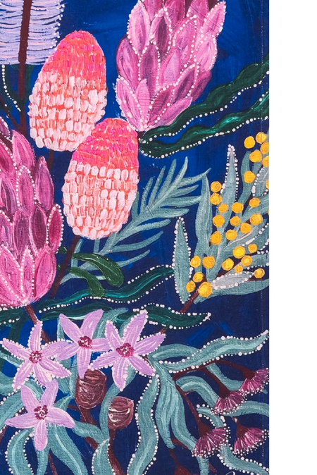 Proud Yued Noongar artist, Jessica Begg draws inspiration from her family, the native flora of the Yued region, the heat in the summer, the Moore River and the meeting places in between. Her distinctive contemporary style is her interpretation of her culture through an unrestricted palette and traditional shapes.