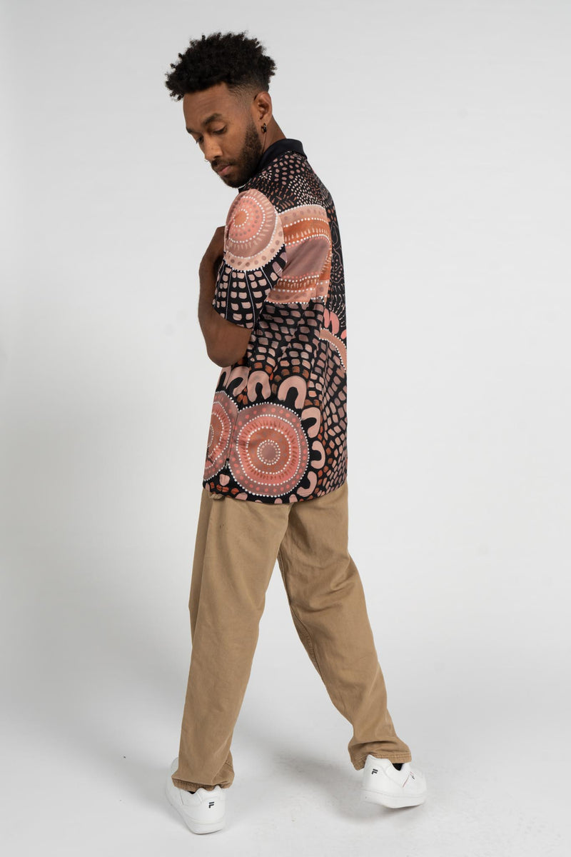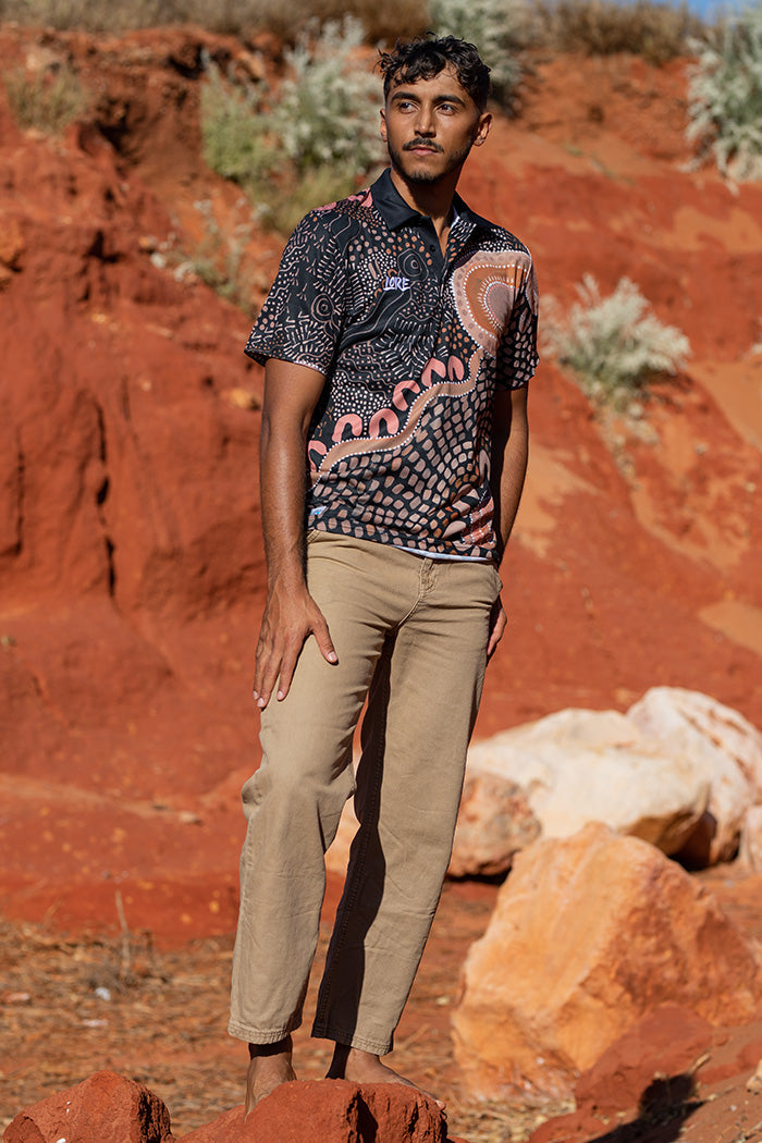 Crafted from 100% recycled Polyester, these unisex polos give you strong sun protection and a stylish and comfortable look that can be worn anywhere. Our unisex polos are designed to fit anyone and feature gorgeous Indigenous designs. This unisex polo shirt features ‘Gathering on Country’, a gorgeous artwork by Barkindji Woman Caitlyn Davies-Plummer.
