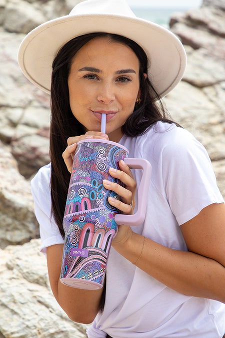 With a generous 1.2L capacity, easy-carry handle and built-in sip straw, these tumblers are as functional as they are beautiful. Crafted from BPA and toxin-free plastic with double-walled stainless steel insulation, they’re leak-proof, reusable and simple to clean. Wrapped in vibrant First Nations artwork, each refill becomes a small moment of support, bringing colour, function, and creativity to your day.