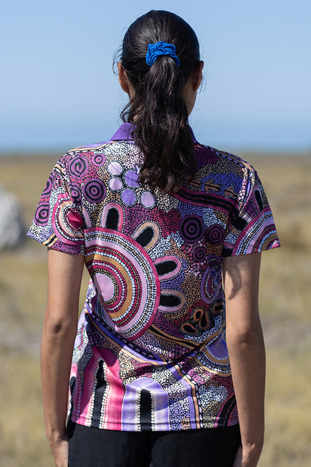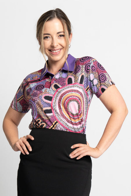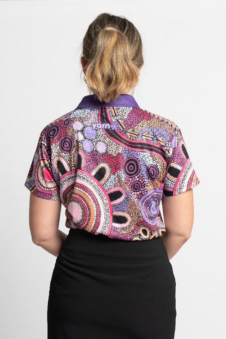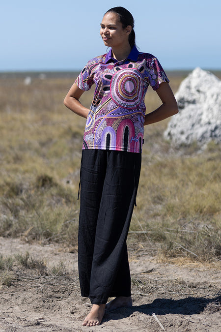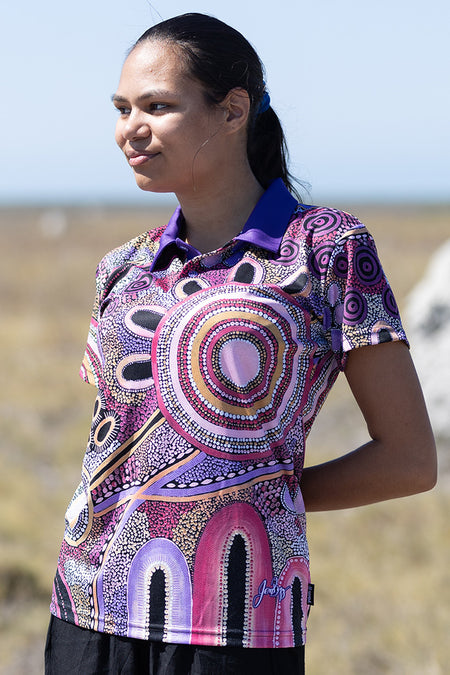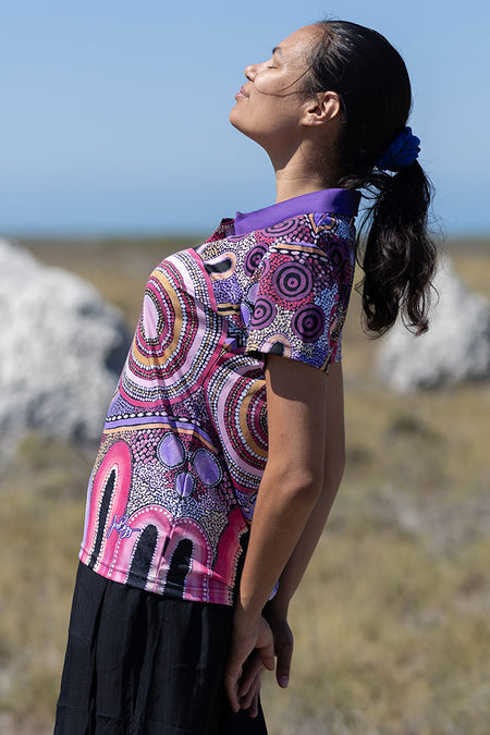 Jessica's art is inspired by family, Country, and Culture in the Yued region in Western Australia. In her debut polo and fashion range she celebrates and honours her heritage through vibrant pieces that each tell a distinct yet connected story.