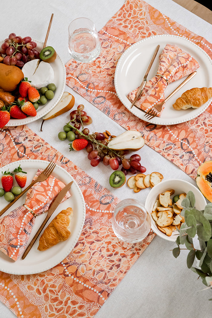 Printed locally in our studio in Meanjin (Brisbane) on natural flax linen, this elegant collection of fine homewares features muted colours in Amanda’s earthy palettes. Perfect for dinner parties, gifts, and adding a touch of natural sophistication around the home and table.