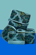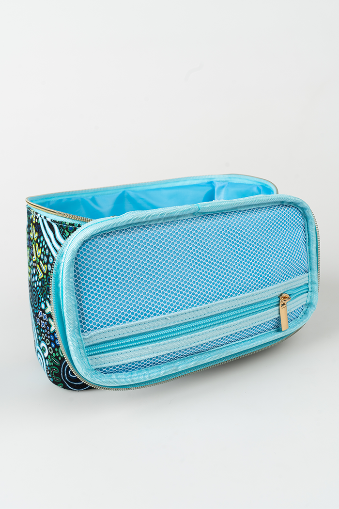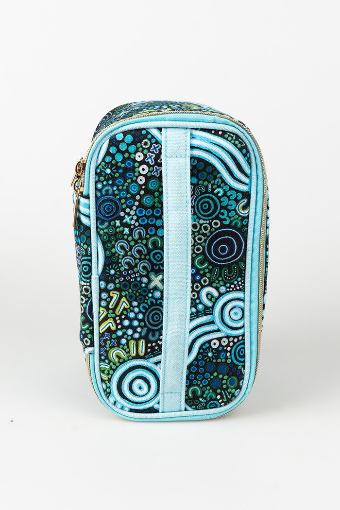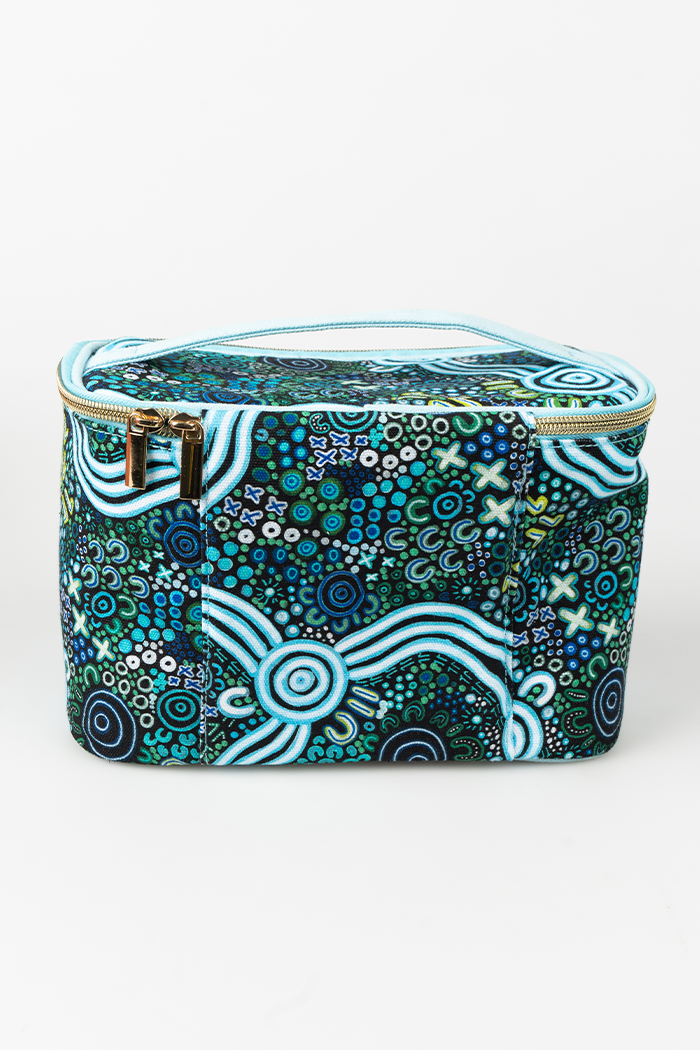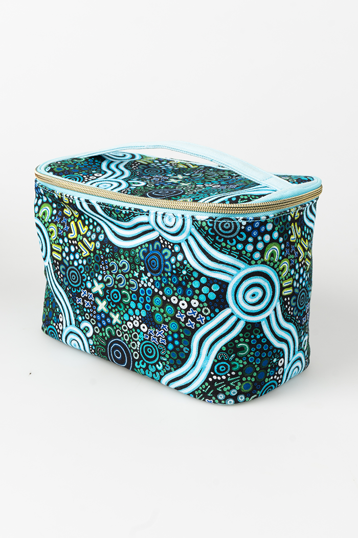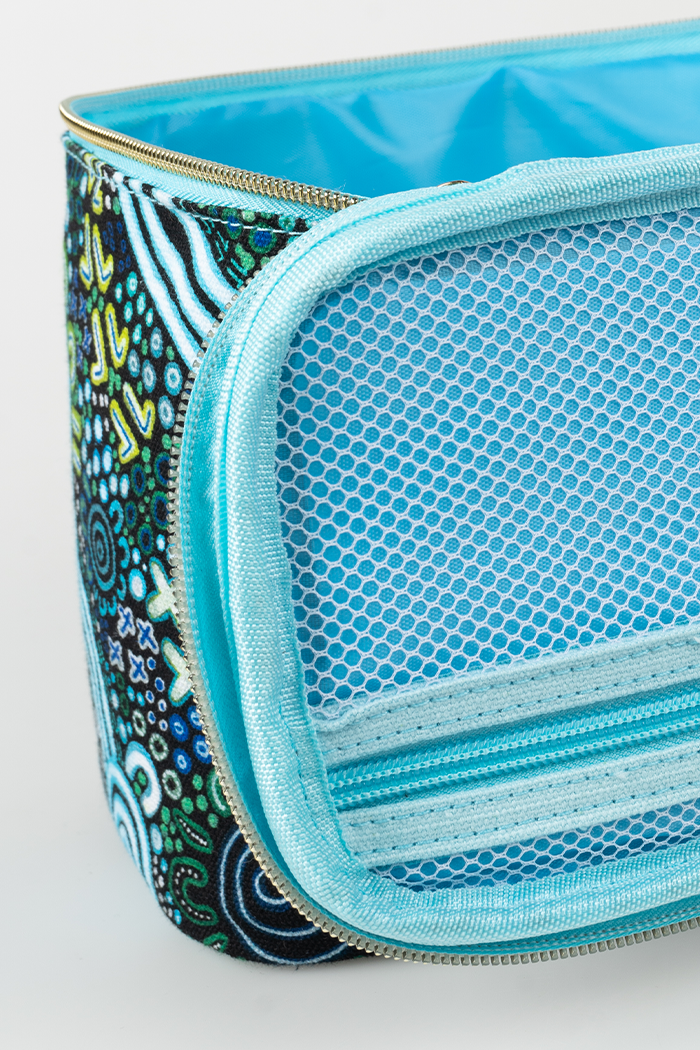 Our brand new line of beauty bags are available in four sizes featuring artworks from the incredible Gundjitmara artist Merindah-Gunya. With durable canvas material, a water resistant lining and sturdy metal zippers, these bags are perfect for storage and travel for your beauty products, makeup, toiletries and more! Softly structured and cushioned to protect your valuables!