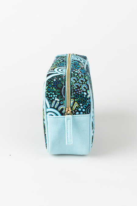 Our brand new line of beauty bags are available in four sizes featuring artworks from the incredible Gundjitmara artist Merindah-Gunya. With durable canvas material, a water resistant lining and sturdy metal zippers, these bags are perfect for storage and travel for your beauty products, makeup, toiletries and more! Softly structured and cushioned to protect your valuables.