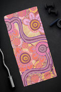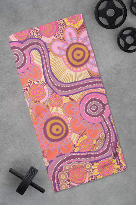 Featuring First Nations artwork print on the front and 100% cotton backing, each towel is designed for softness, durability, quick-drying, and superior absorbency. Ideal for gym sessions, yoga, or outdoor activities, it’s the handy companion that keeps you fresh and ready to move.