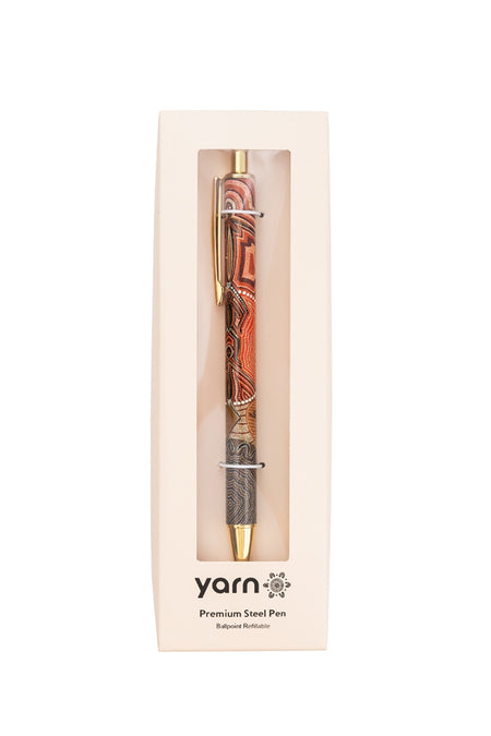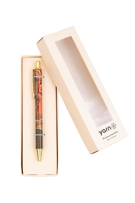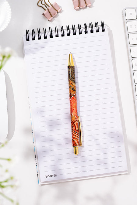 Each black ink pen showcases a stunning artwork by talented First Nations artists from across Australia. With a sturdy metal body and precise 0.7mm nib, these pens offer a premium writing experience. Presented in a gift box, they’re a beautiful and thoughtful gift for any occasion.