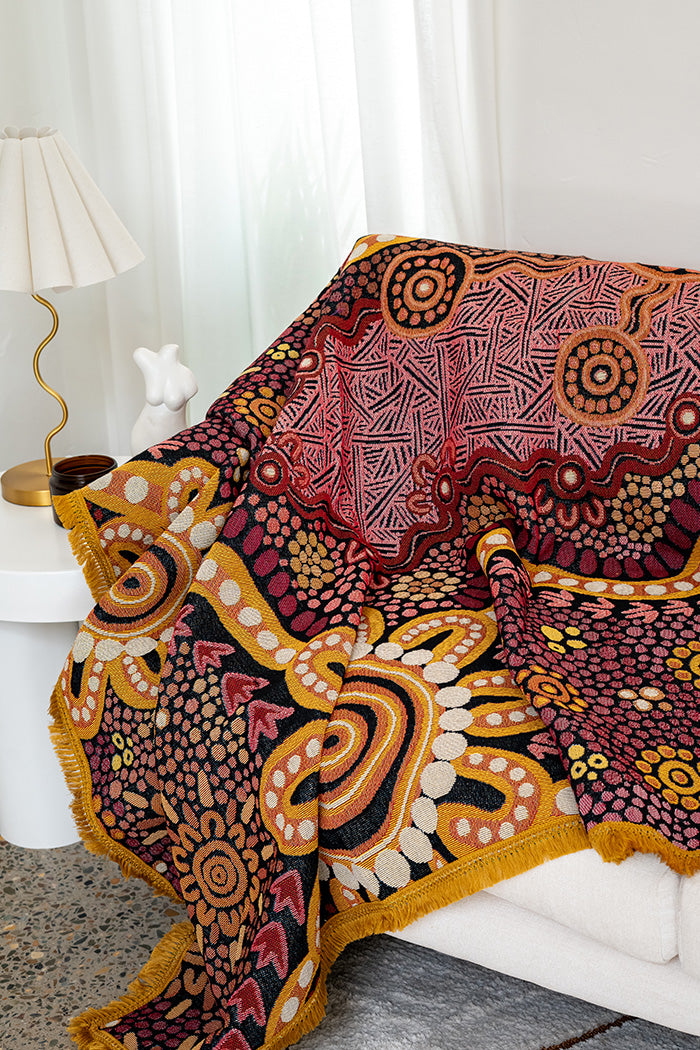 Transform your living room or next adventure with stunning First Nations artwork knitted throw rugs. The beautifully crafted rugs invite you to relax in style while celebrating Culture, creativity, and the great outdoors. Perfect for a trip to the park, beach, home decorating, or keeping the little ones comfortable on days out.